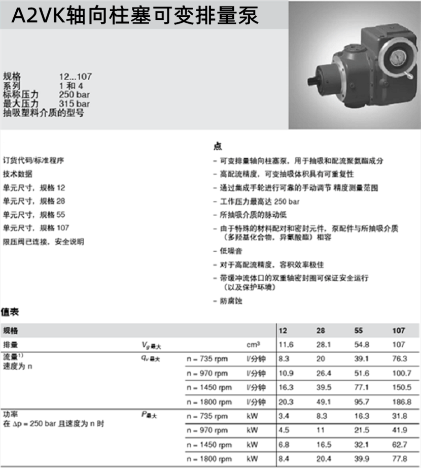 力士乐轴向柱塞可变排量泵A2VK技术参数: