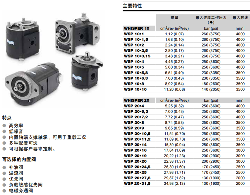 威世(WHISPER)系列拥有国际专利技术,专门的低噪音新型齿轮泵,轴、法兰和接口尺寸及形式有多种标准可选(包括SAE,DIN,EUROPEAN等),应用广泛。