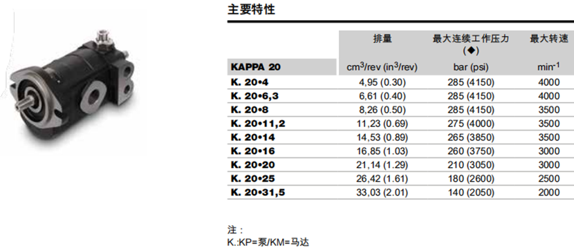 两段式铸铁齿轮泵和齿轮马达。 KAPPA 系列有SAE和欧洲标准的安装法兰和侧面及后面安装油口。