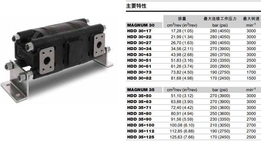 排量范围:从17,28 cm3/rev (1.05 in3/rev) 到125,63 cm3/rev (7.66 in3/rev);分30, 35两个规格